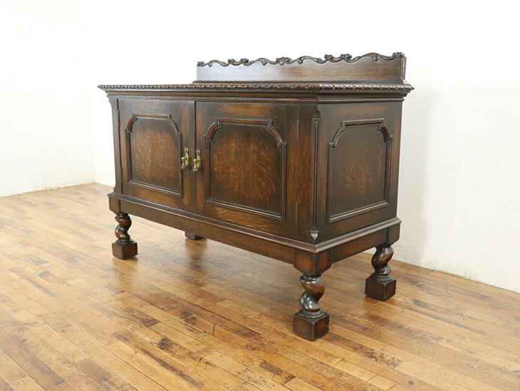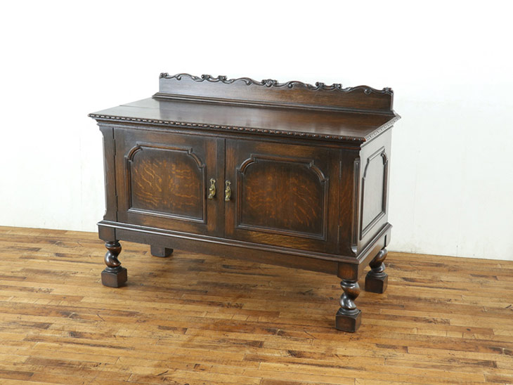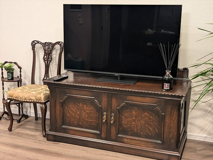 テレビボードとしてぴったりサイズなこちらのアンティーク家具、実はサイドキャビネットの足をカットし、ローボードにリメイクをしてお使いいただいています。