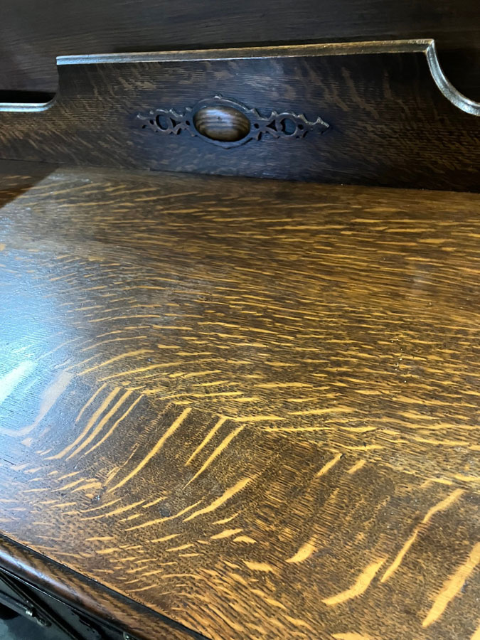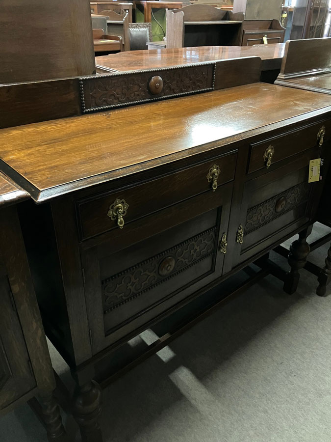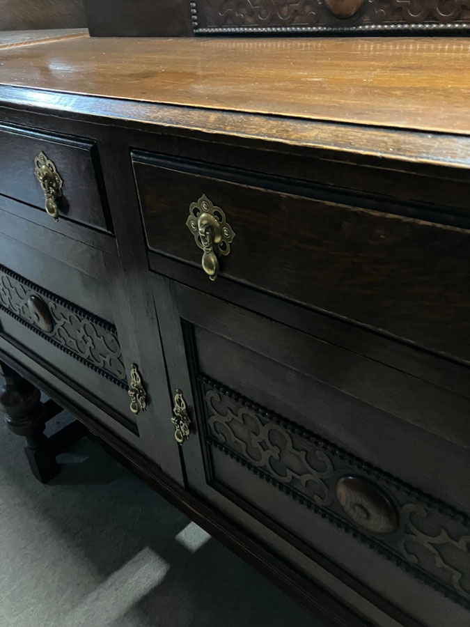 収納部分は上に引き出し、その下に扉という、横幅120cmくらいのイギリスアンティーク家具のサイドボードとして定番的なレイアウトです。