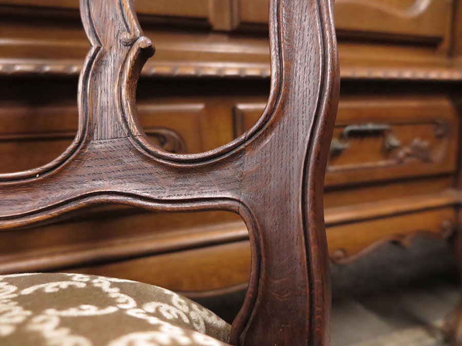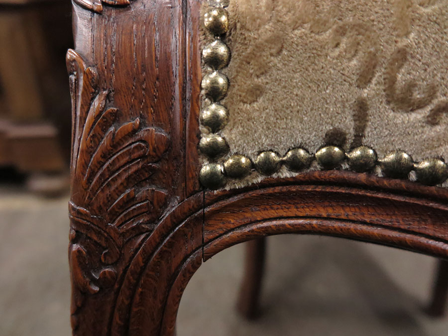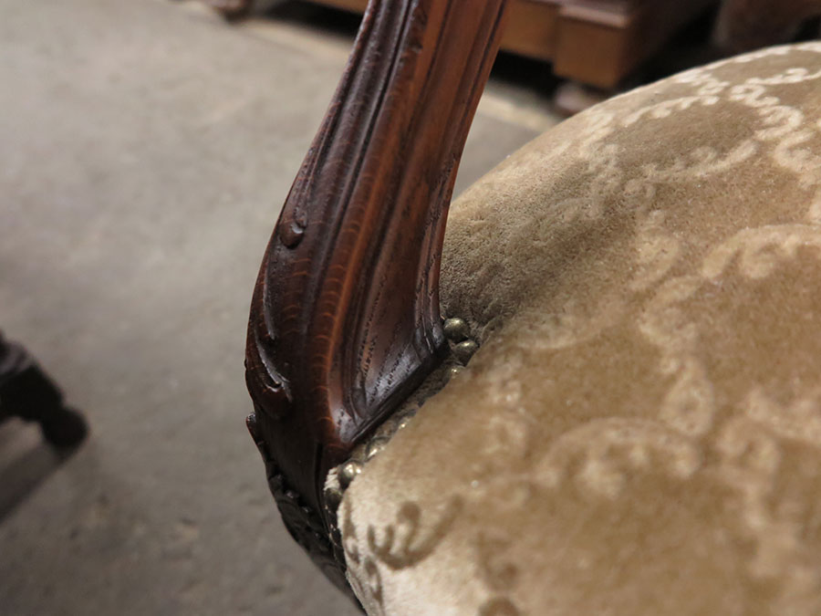 フランスアンティーク家具のアームチェアではこの部分に特徴的なデザインがされていることが多いのですが、その中でも丸くくりぬいた透かし彫りになっているのは非常に特徴的で、あまり見つからないものと言えます。