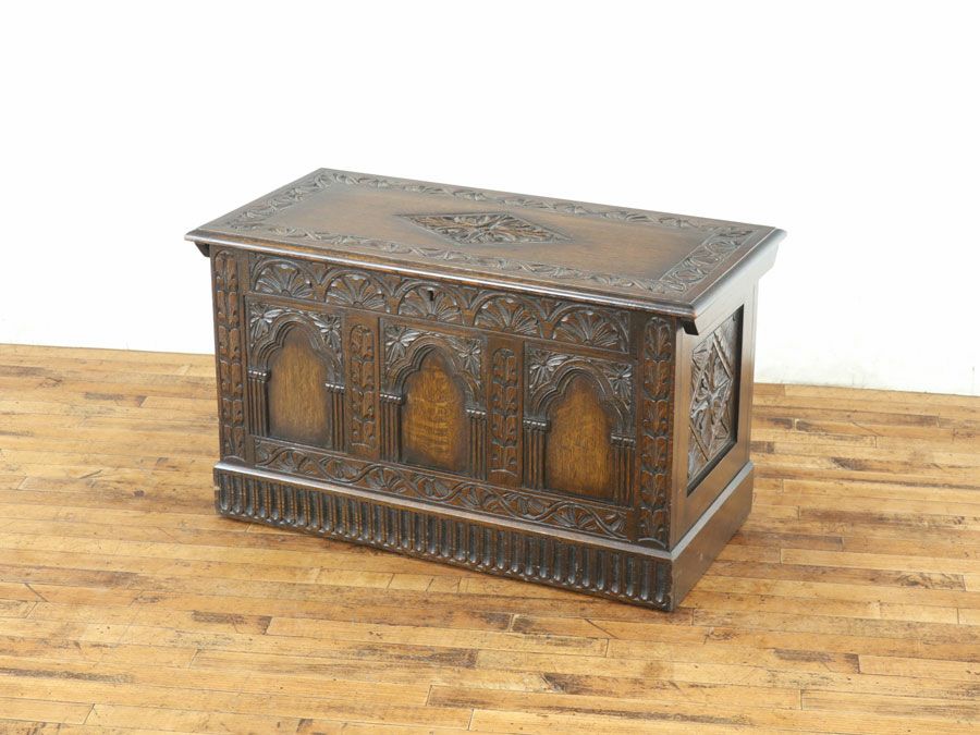 所狭しと彫刻が施された、非常に美しいたたずまいのコファーです。