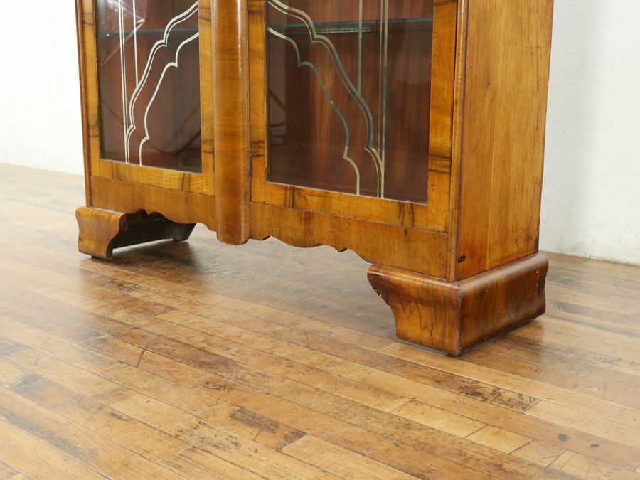 当店では基本的には側面は木製、棚板も木製でガラスやステンドグラスがついたキャビネットで奥行き40センチ位までのものをブックケースと呼んでおります。 本を収納するという意味では、その他のキャビネット類やサイドボード、ブックシェルフ(オープンブックケース)などももちろん本を収納していただいても問題ございません。 キャビネットと呼んだほういいような大型のものや棚板にガラスが使われていてショーケースのようなものもあるので、アンティークの分類は例外が多く難しいですね。 比較的薄型で本やカップ類などを収納したいとお考えの方おすすめの家具です。 食器類などの収納で比較的荷重をかけず、頻繁にご使用になるということであれば棚板がガラスになったショーケースがおすすめです。 ショーケースと比べて側面も木製であることで柱や横桟などと接着固定されているため剛性が高いところがショーケースとブックケースの大きな違いと言えると思います。 棚板も木製であることで耐荷重もブックケースのほうが上ですね。