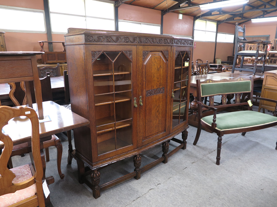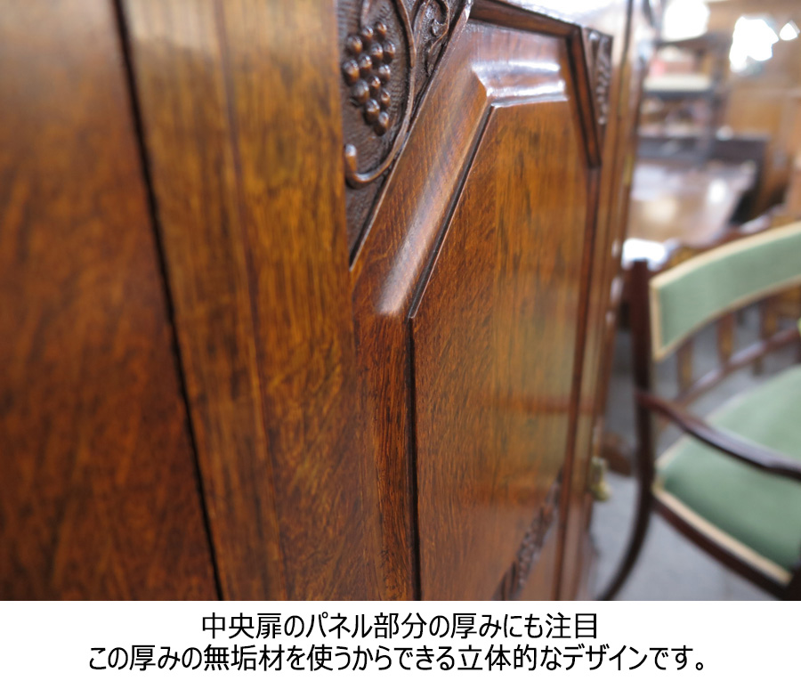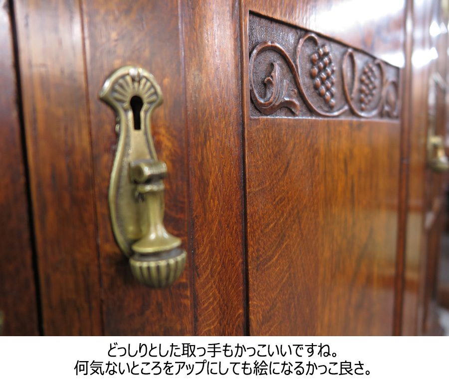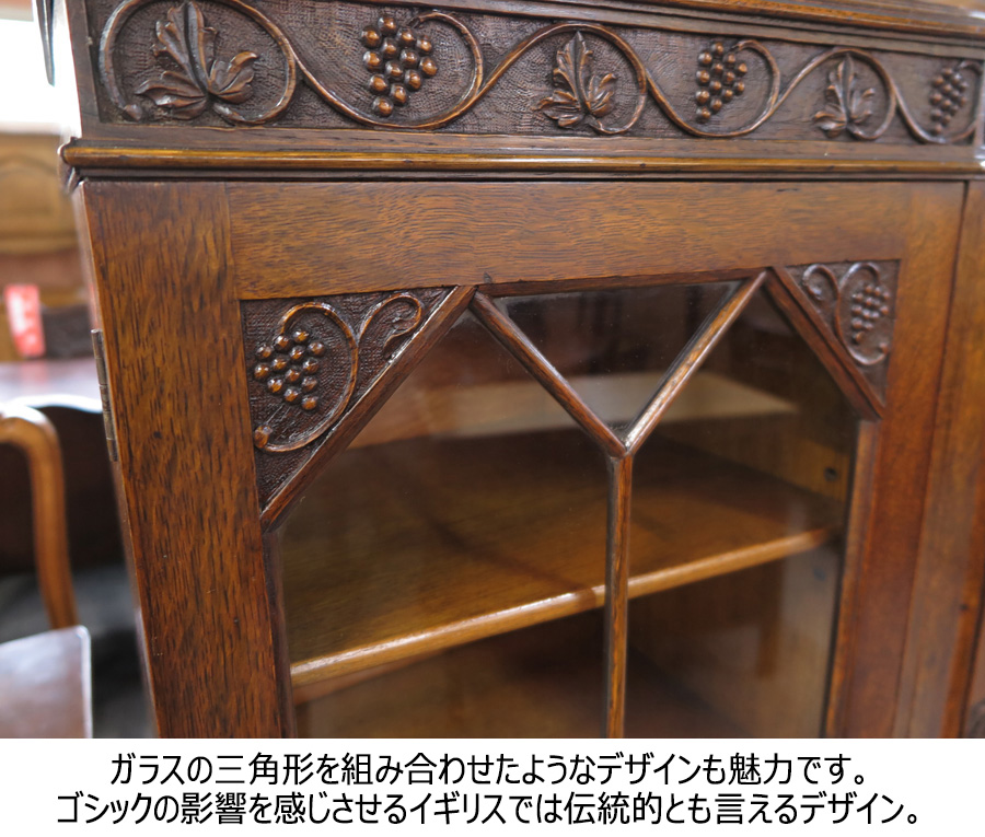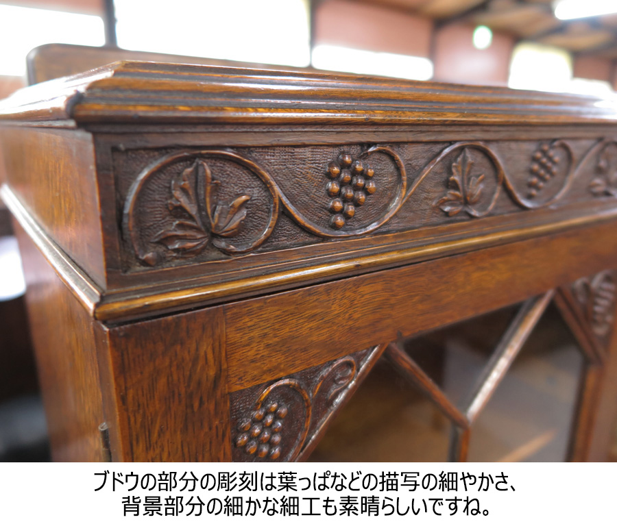 ブドウモチーフの彫刻がされたブックケース自体が数の少ないものですが、3枚扉でこれだけのしっかりとした造りのものとなるとなおさら見つけづらいです。