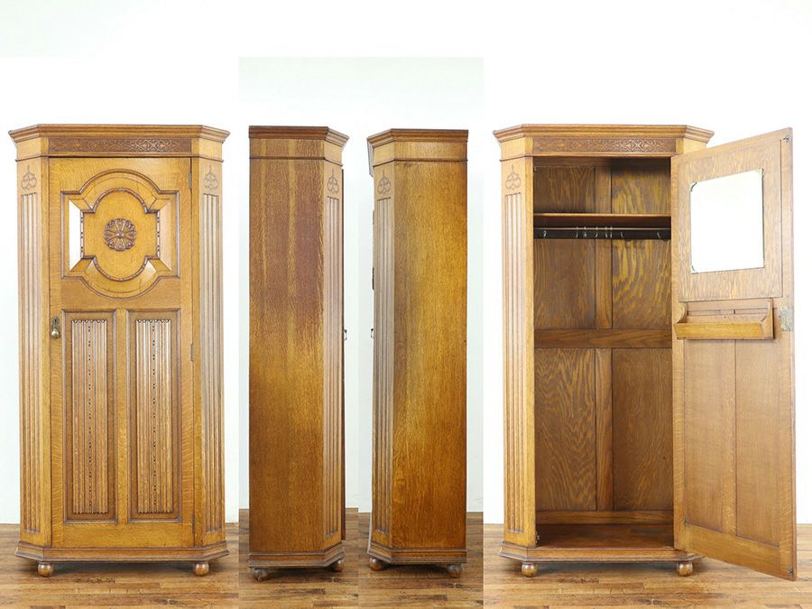アンティークのワードローブは大きな箱型の筐体に縦長の扉がついた収納量の多さ、使いやすさが魅力だと思います。ワードローブレールがついているお品が多く、丈の長いドレスなども収納しやすいところも魅力です。背が高めで細身と言えるサイズのお品も多く、棚板をつけて食器棚やシューズボックスのような収納棚としてお使いになる方も多いです。(棚板取り付けも承りますのでご注文時にご相談ください。)背が高いとそれだけ視界にも入りやすく、インテリアとしてお部屋の雰囲気を変えてくれると思います。海外のホテルのような雰囲気になるかも。